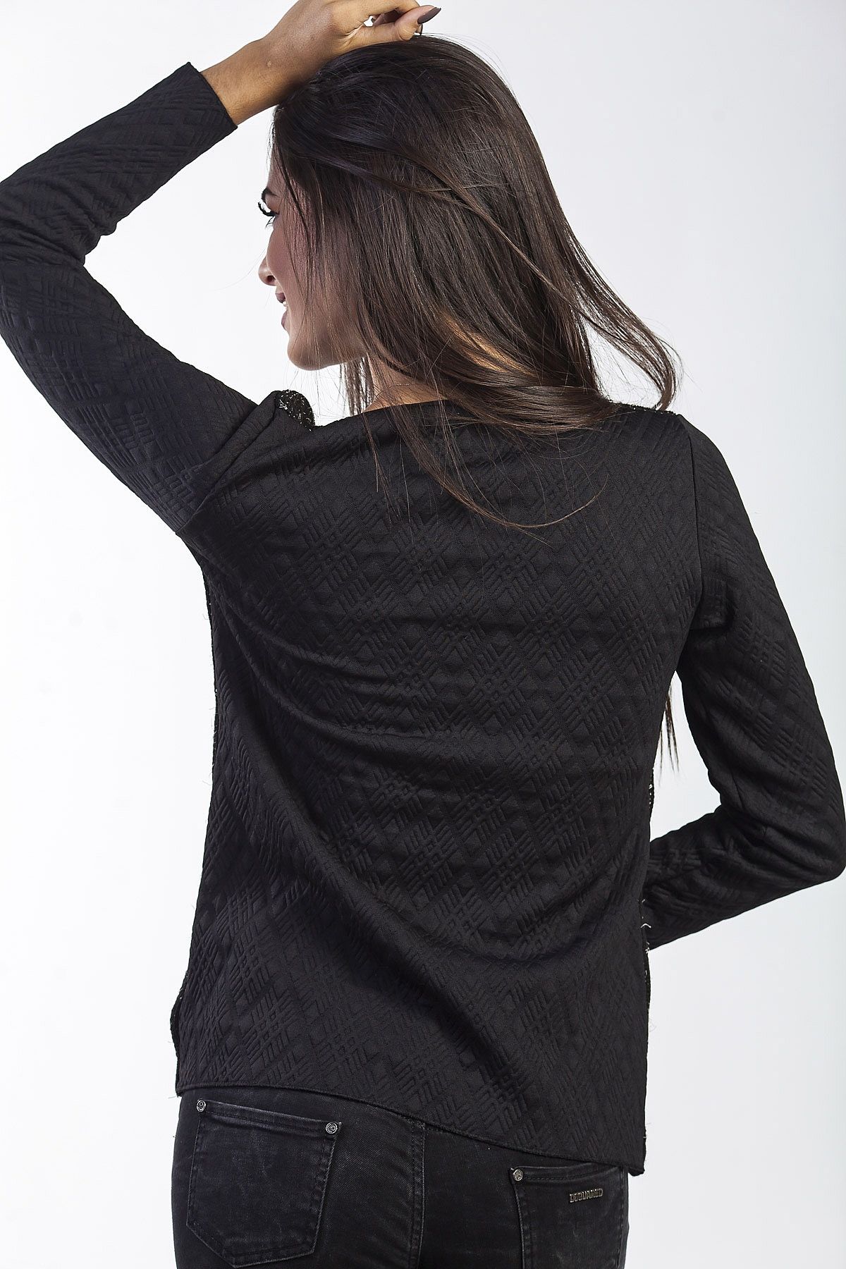 Πλεκτό μαύρο με άγκυρα στην μπροστινή πλευρά. Η πλάτη και τα μανίκια της μπλούζας είναι από ύφασμα με ανάγλυφη υφή. Η γραμμή του είναι πιο στενά μανίκια και τετράγωνο σώμα.