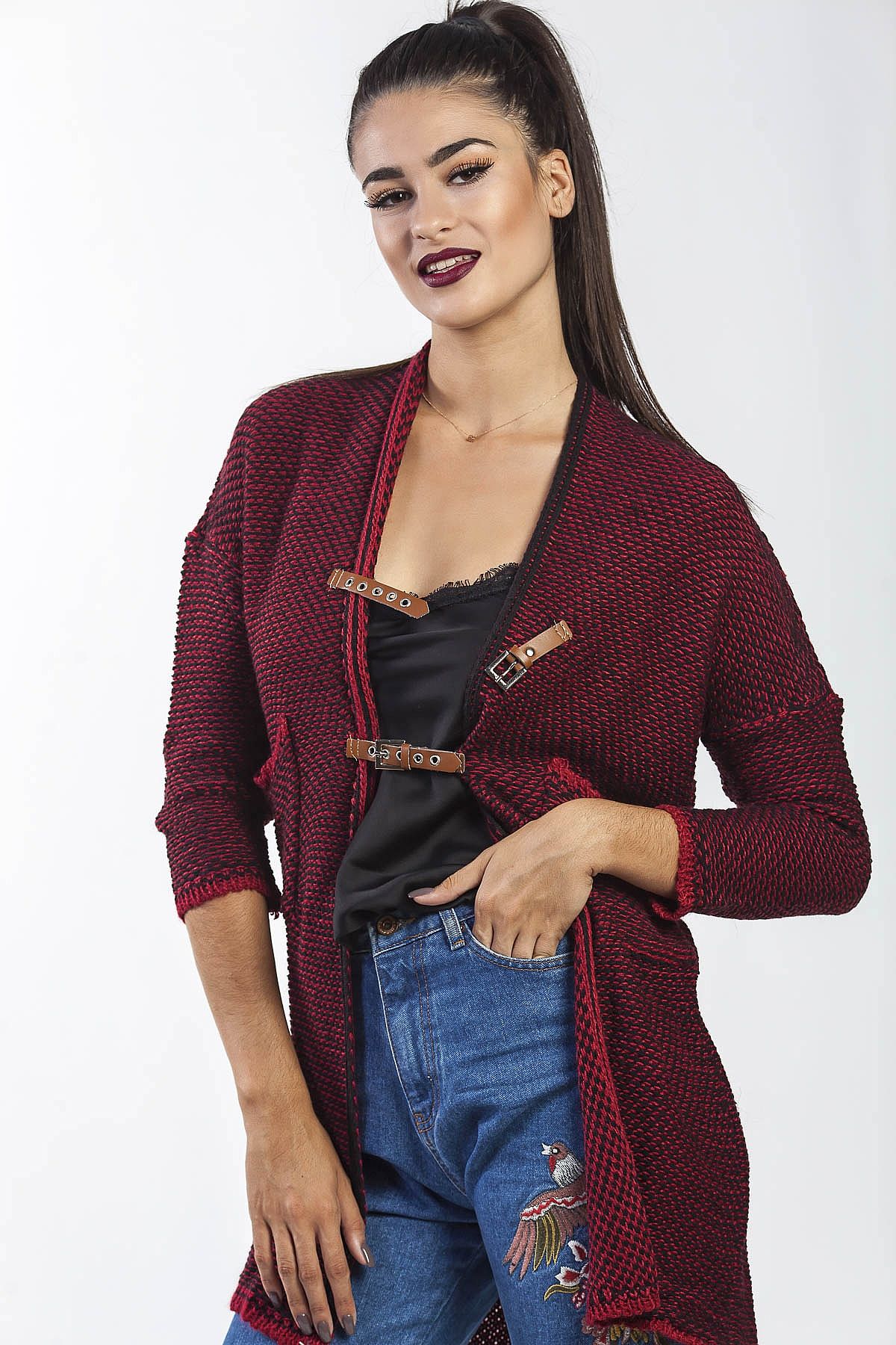 Ζακέτα μπορντό μαύρη με τσέπες, έχει ιδιαίτερη πλέξη και κλείνει με ταμπά ζωνάκια.
