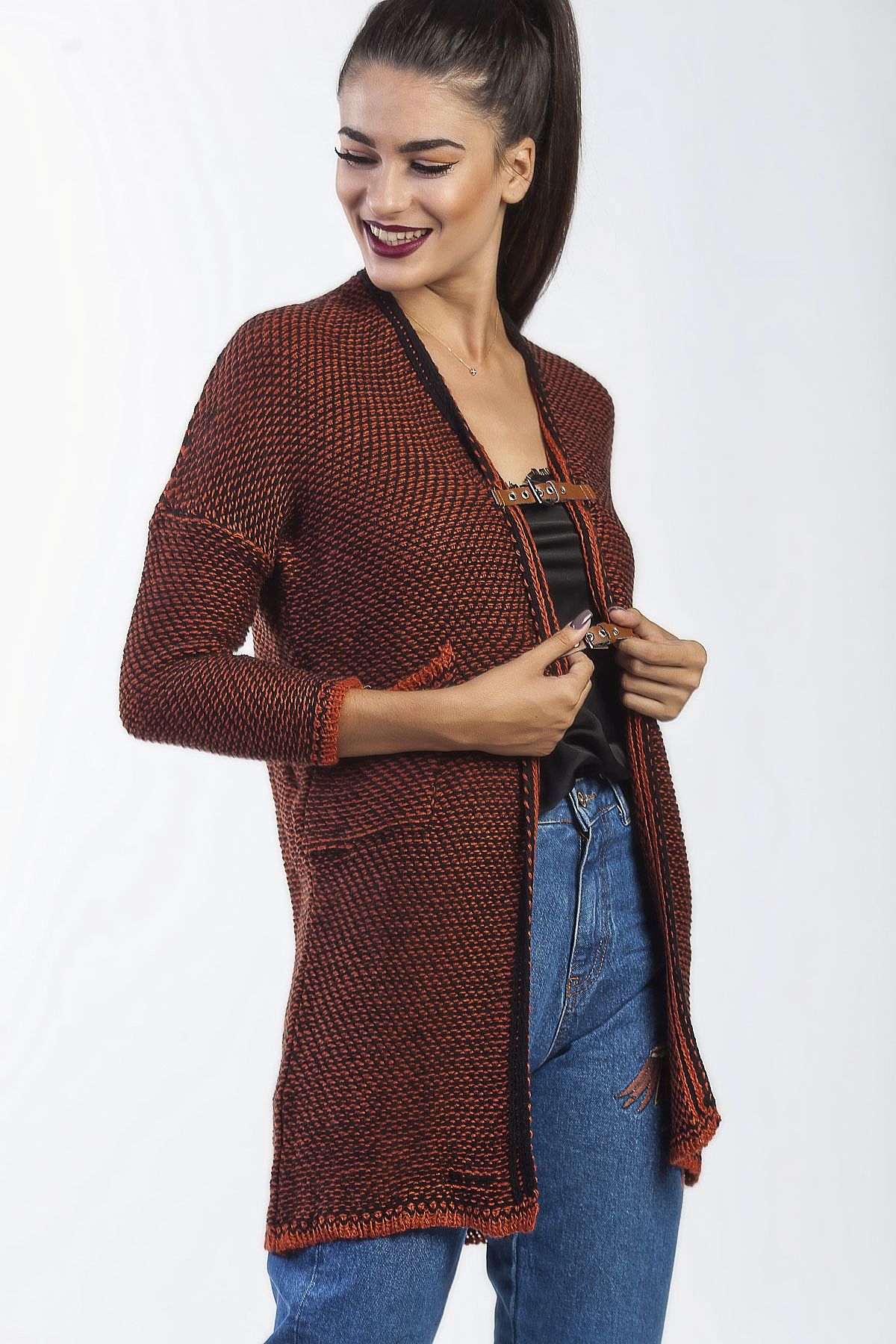 Ζακέτα εκάι μαύρη με τσέπες, έχει ιδιαίτερη πλέξη και κλείνει με ταμπά ζωνάκια.