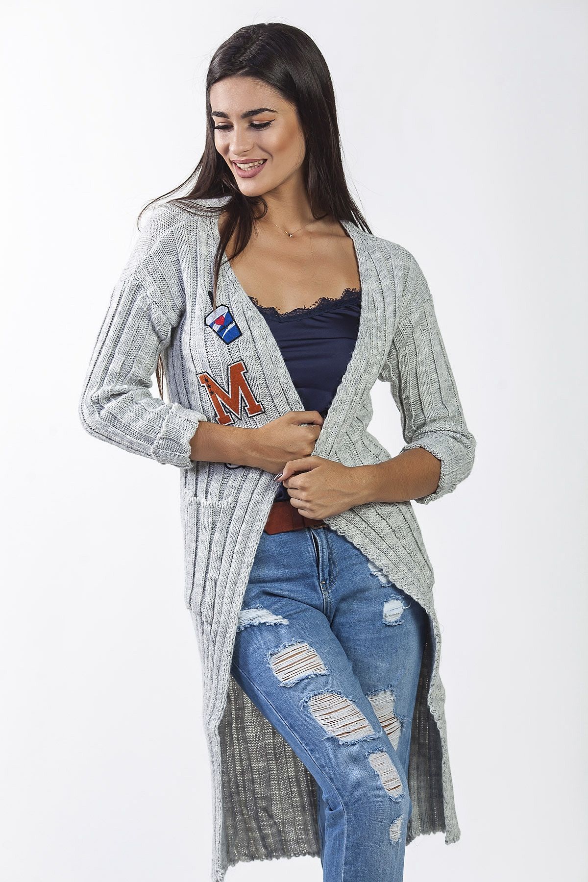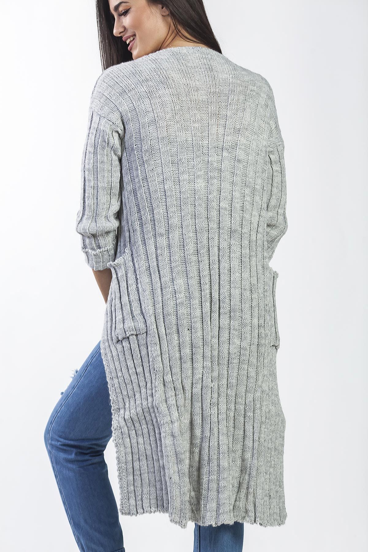 Ζακέτα πλεκτή γκρι με μοτίφ, μακρυά και με τσέπες, στενή γραμμή στα μανίκια και στο σώμα.