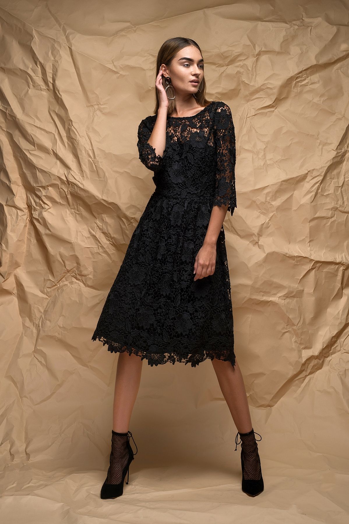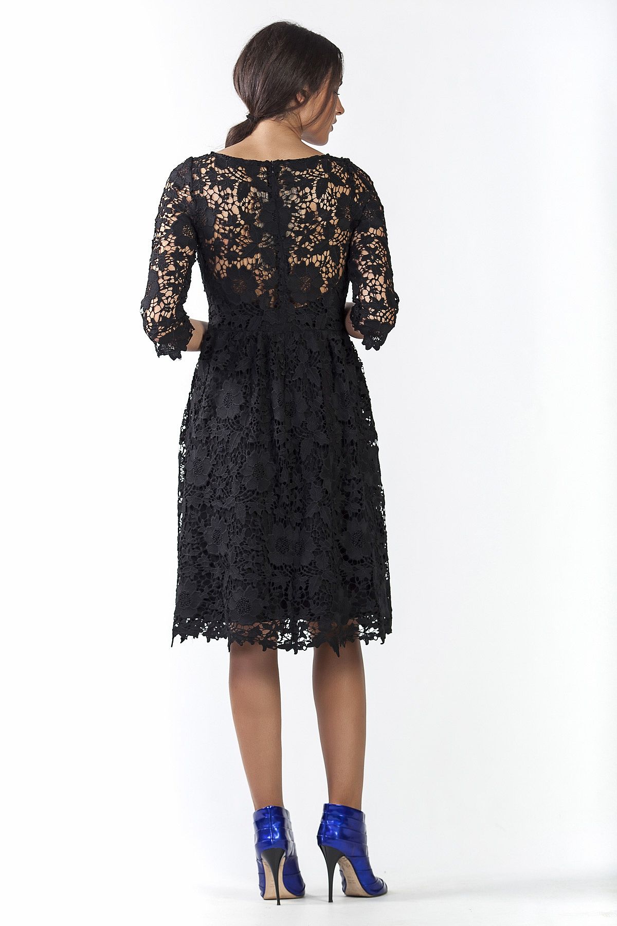 Φόρεμα όλο δαντέλα σε ρομαντικό στυλ με κομμάτια διαφάνειας στο μπούστο, στα μανίκια και στην πλάτη.