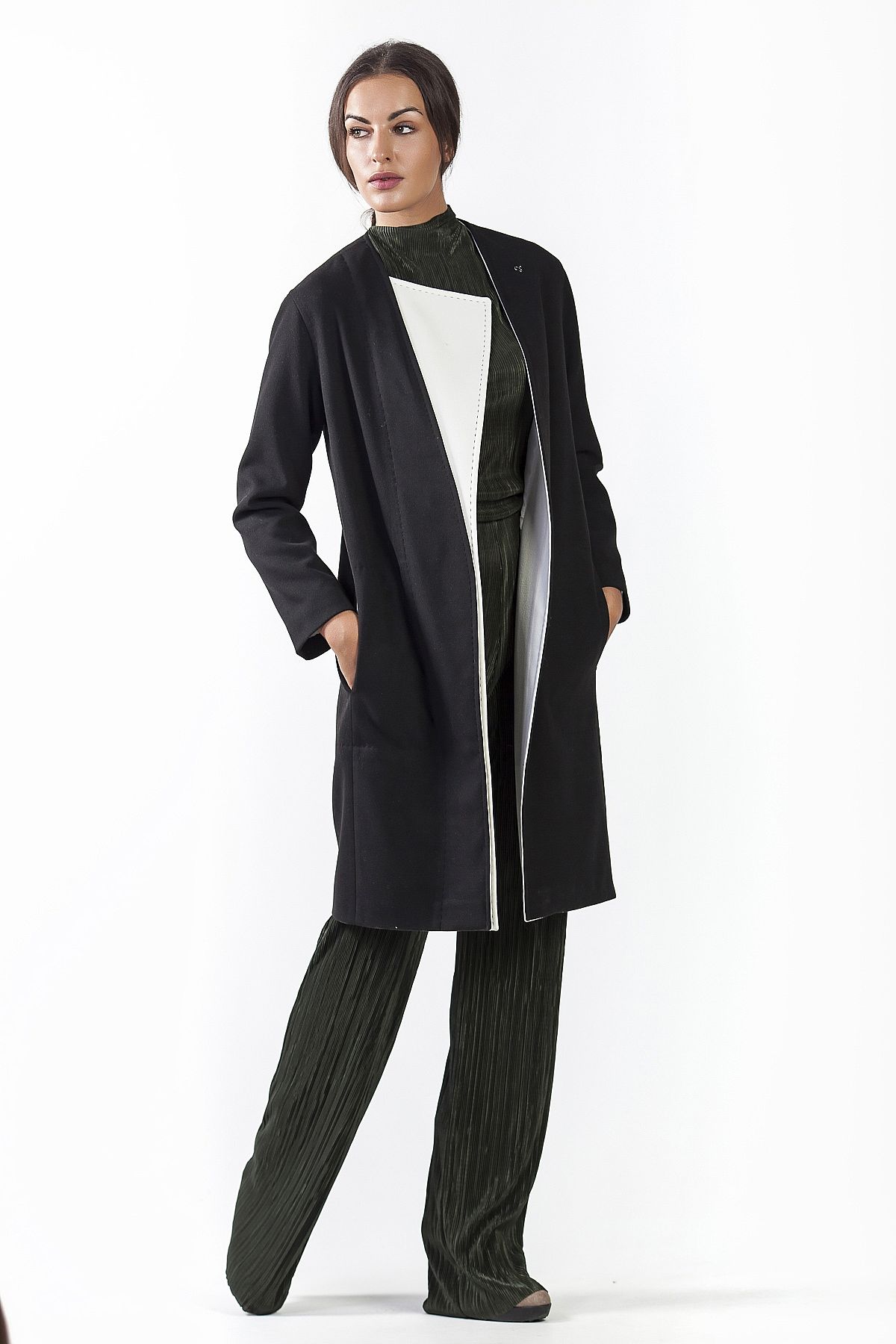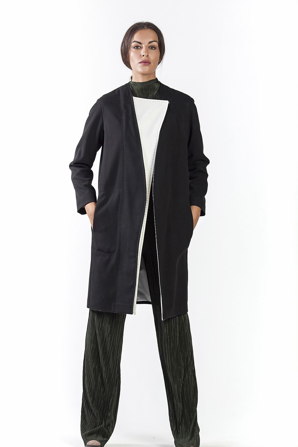 Παλτό μαύρο με λευκές λεπτομέρειες και ζώνη στην μέση. Κλείνει με τρουκς εσωτερικά. Πολύ ιδιαίτερο παλτό σε minimal στυλ.