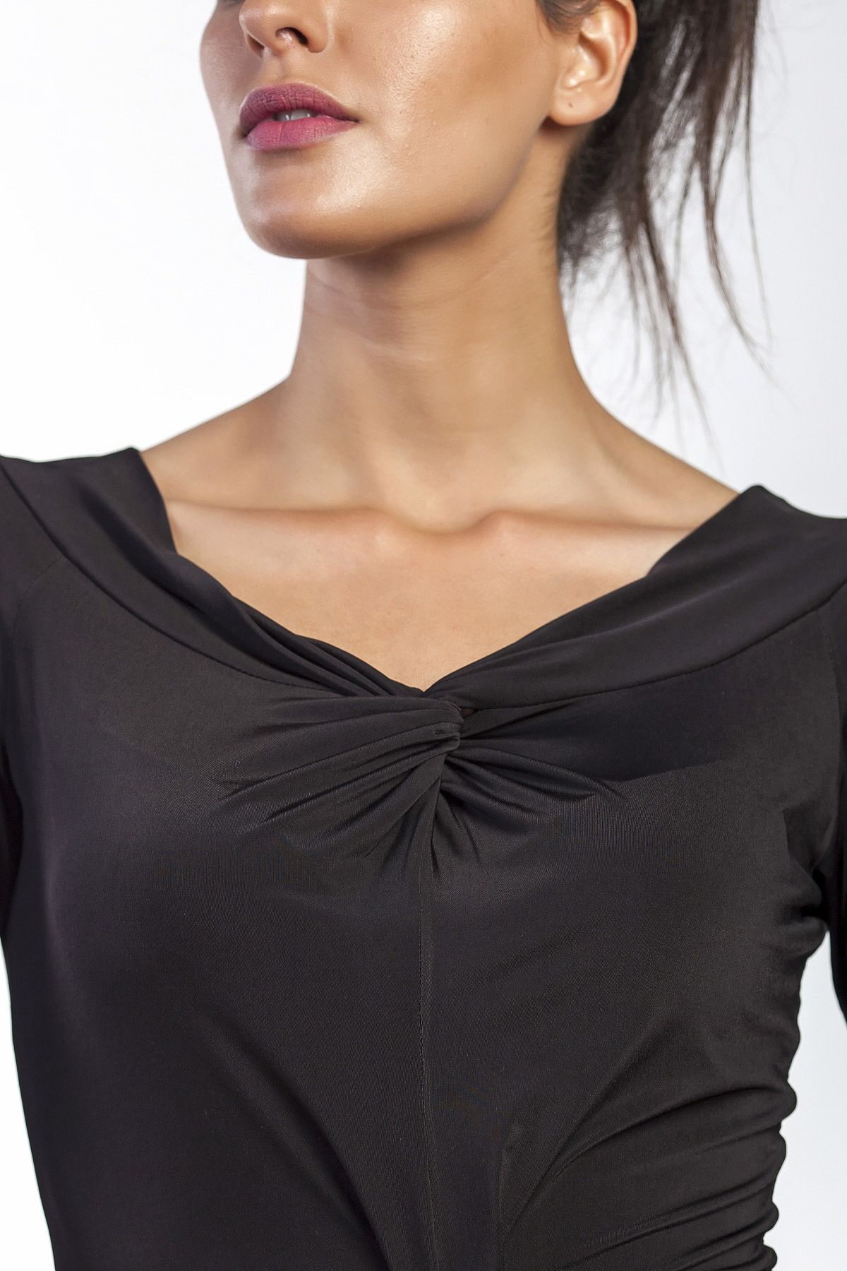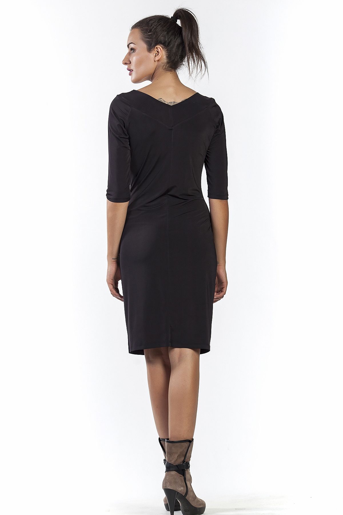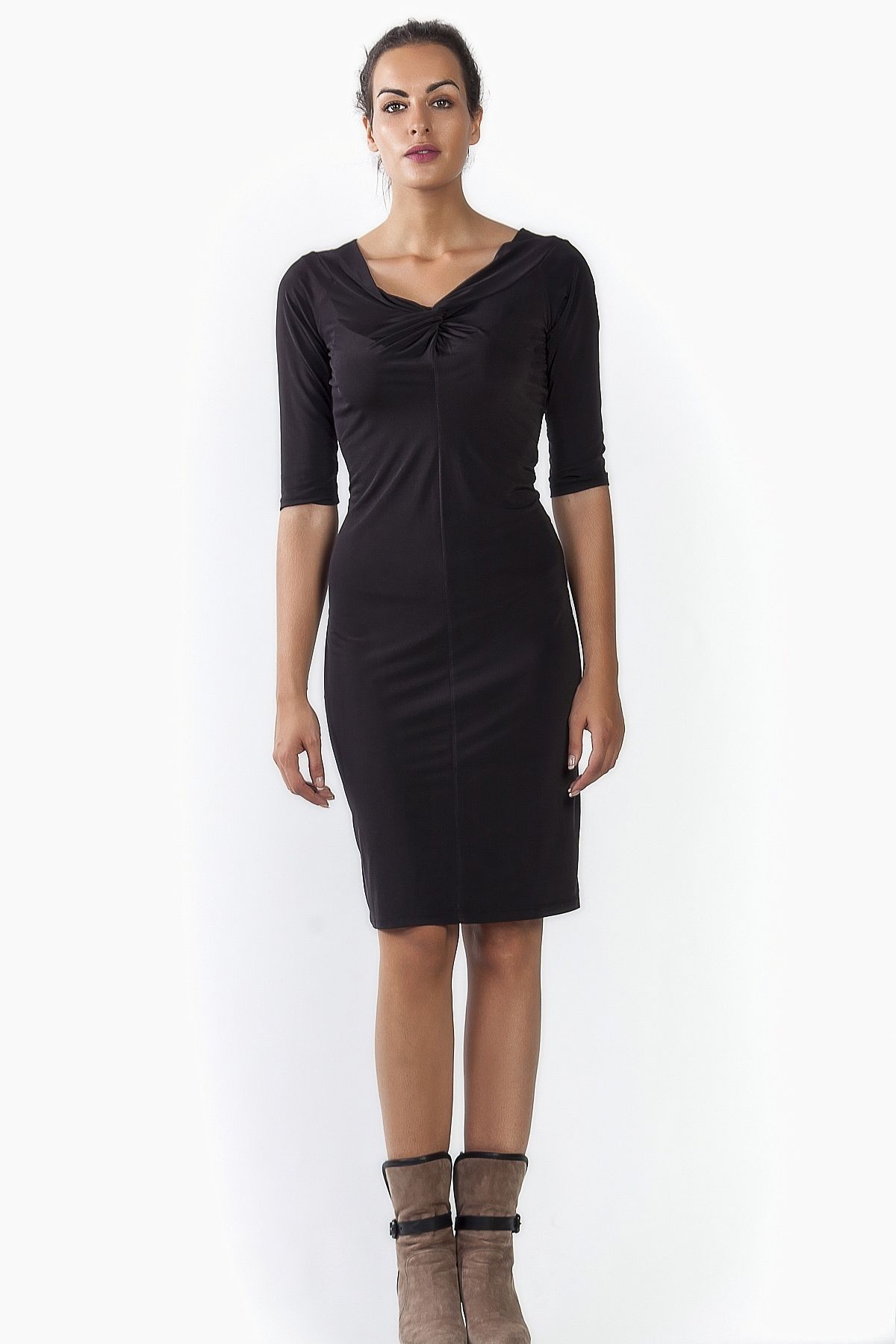 Φόρεμα μαύρο με κόμπο στο στήθος, γραμμή ίσια με αρκετή ελαστικότητα και μανίκια 3/4.
