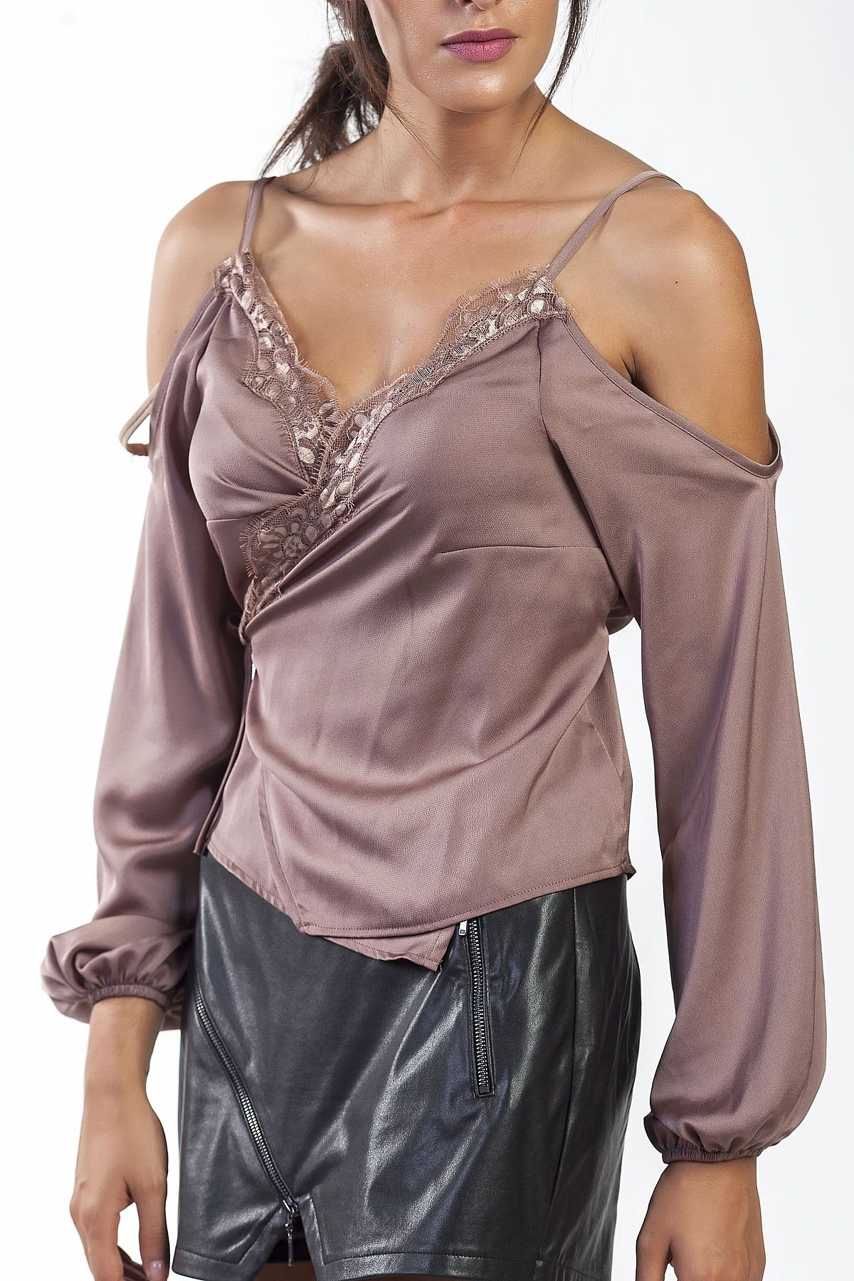 Μπλούζα μπεζ σκούρο κρουαζέ με δαντέλα
