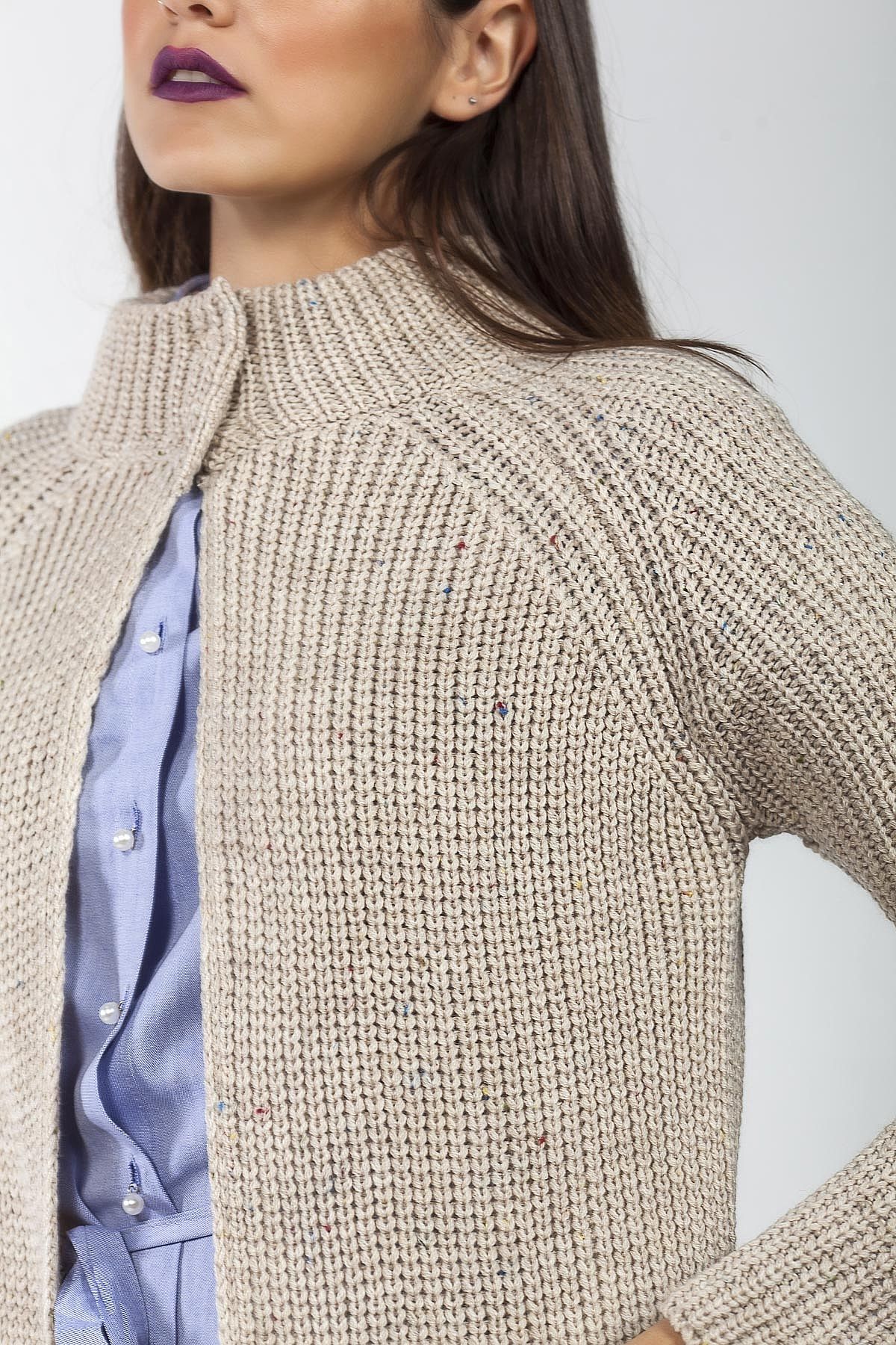 Ζακέτα πλεκτή μπεζ μακρυά με τσέπες και μικρά dots από χρώματα στο νήμα της.