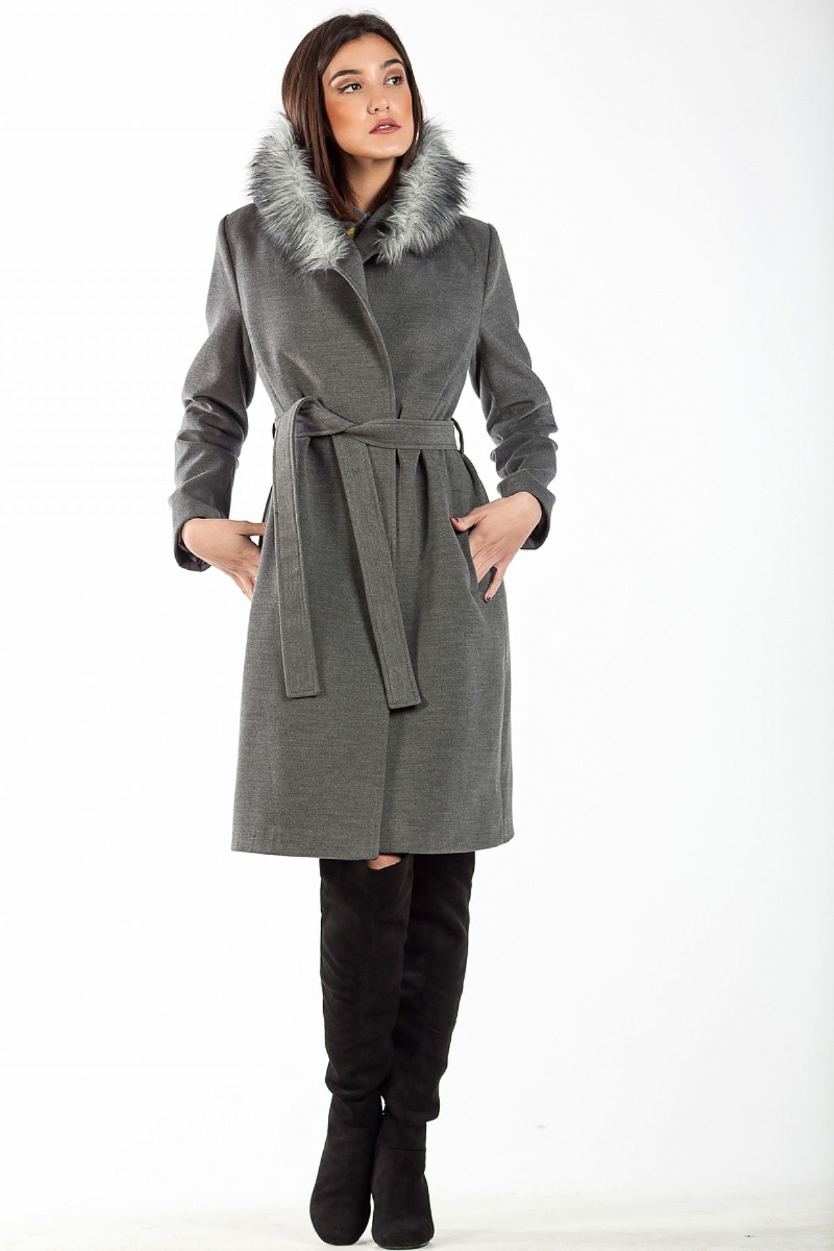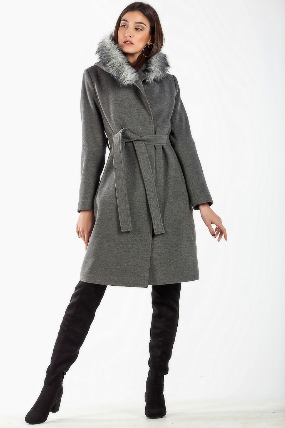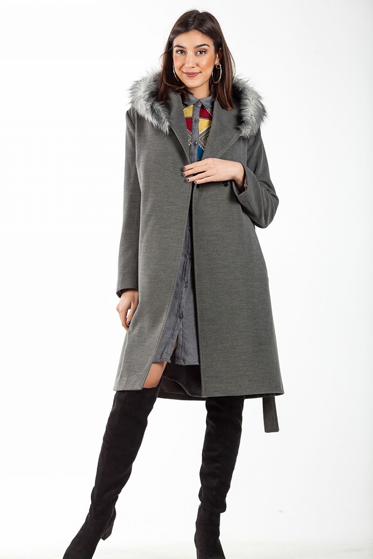 Παλτό γκρι ανοιχτό με κουκούλα και γούνα