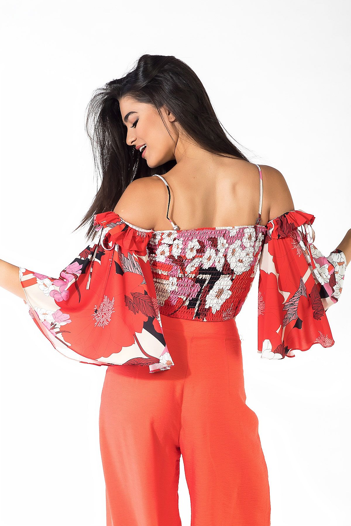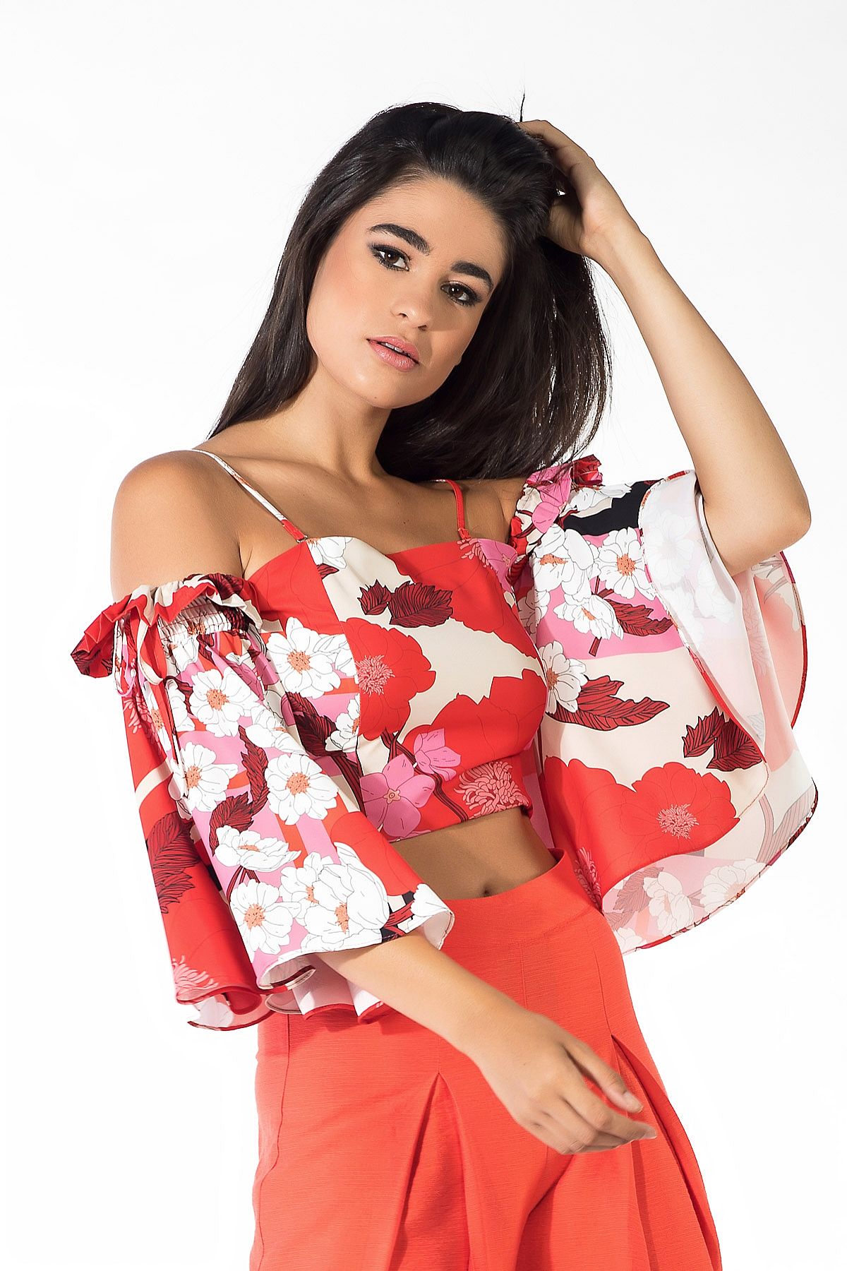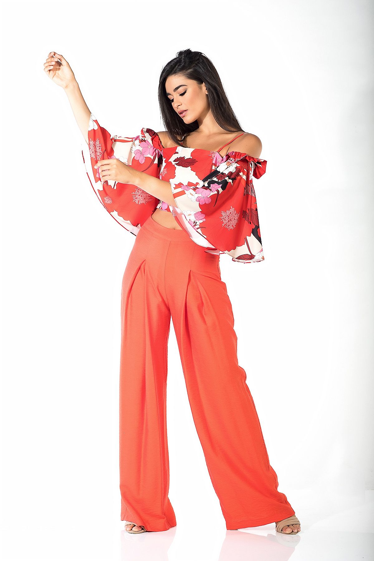 Τοπ κοραλί floral με μανίκια