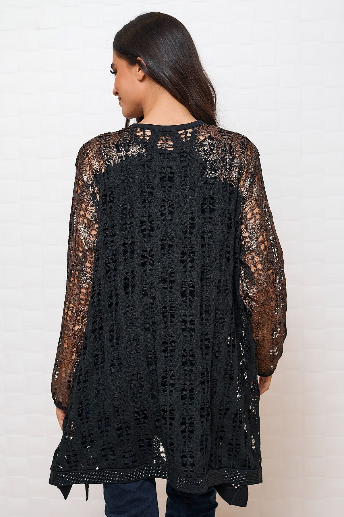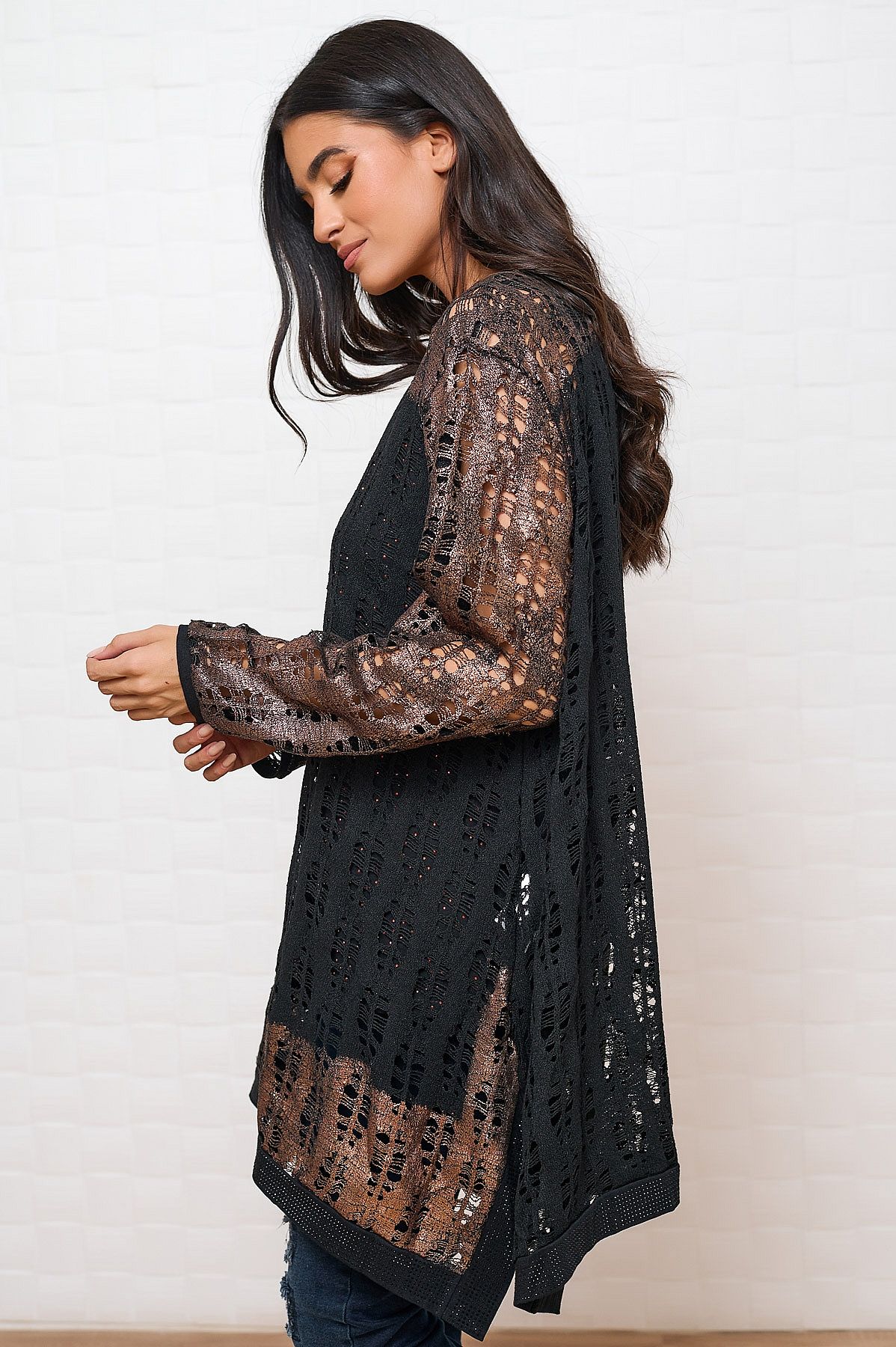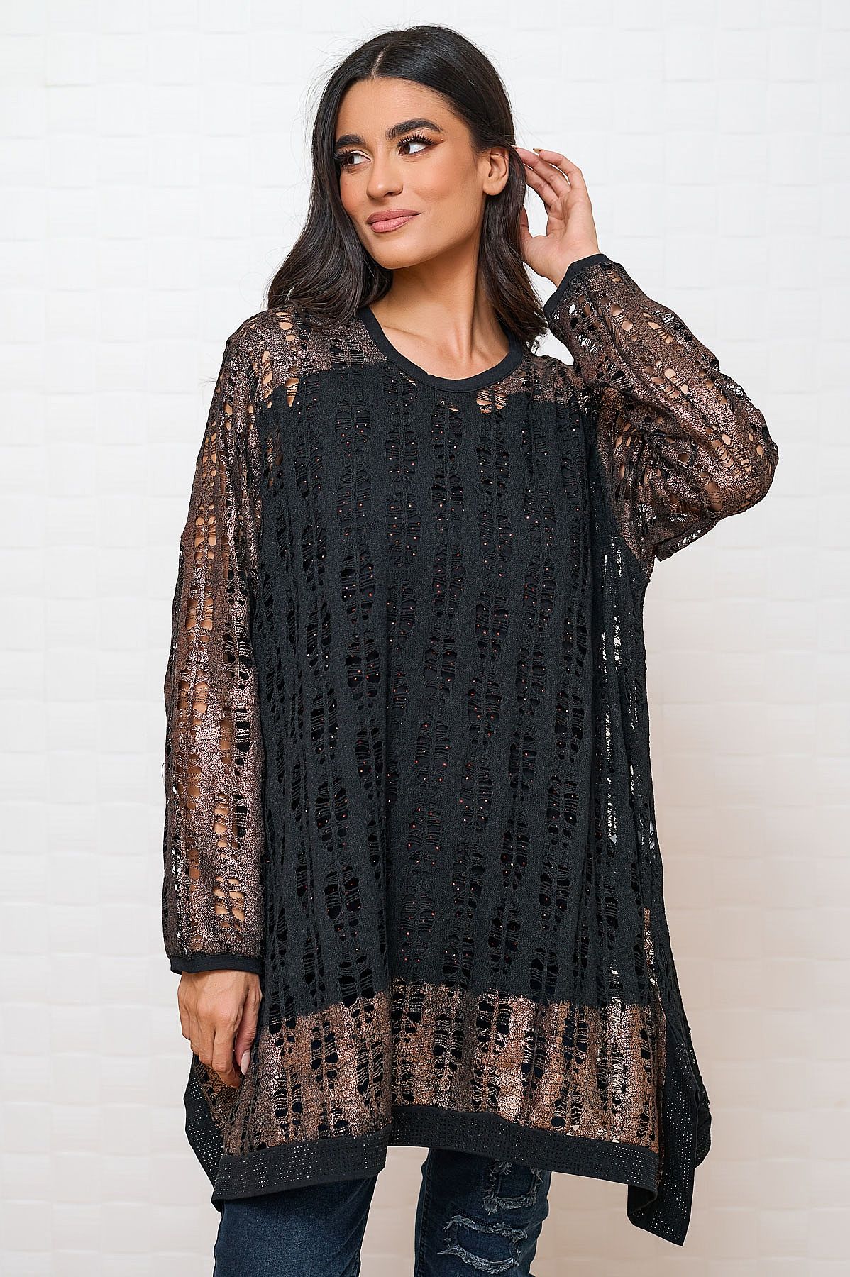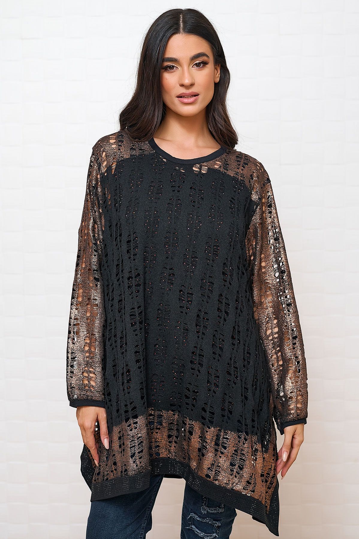 - η από πάνω μπλούζα είναι μακριά διχτυωτή κι ασύμμετρη,με μακριά μανίκια και με bronze λεπτομέρειες και στρας στο κάτω μέρος