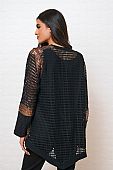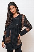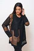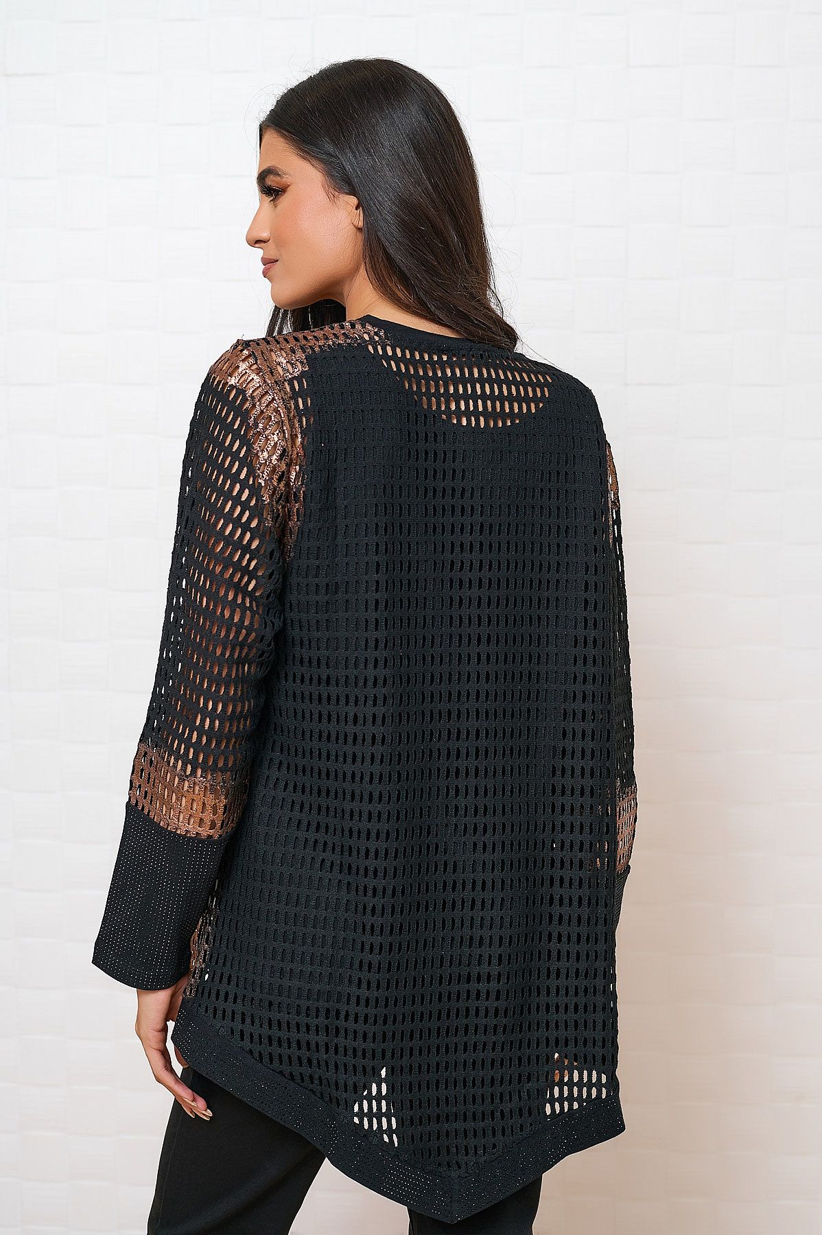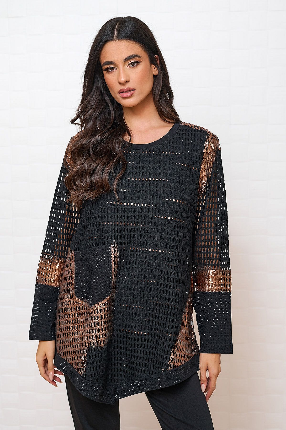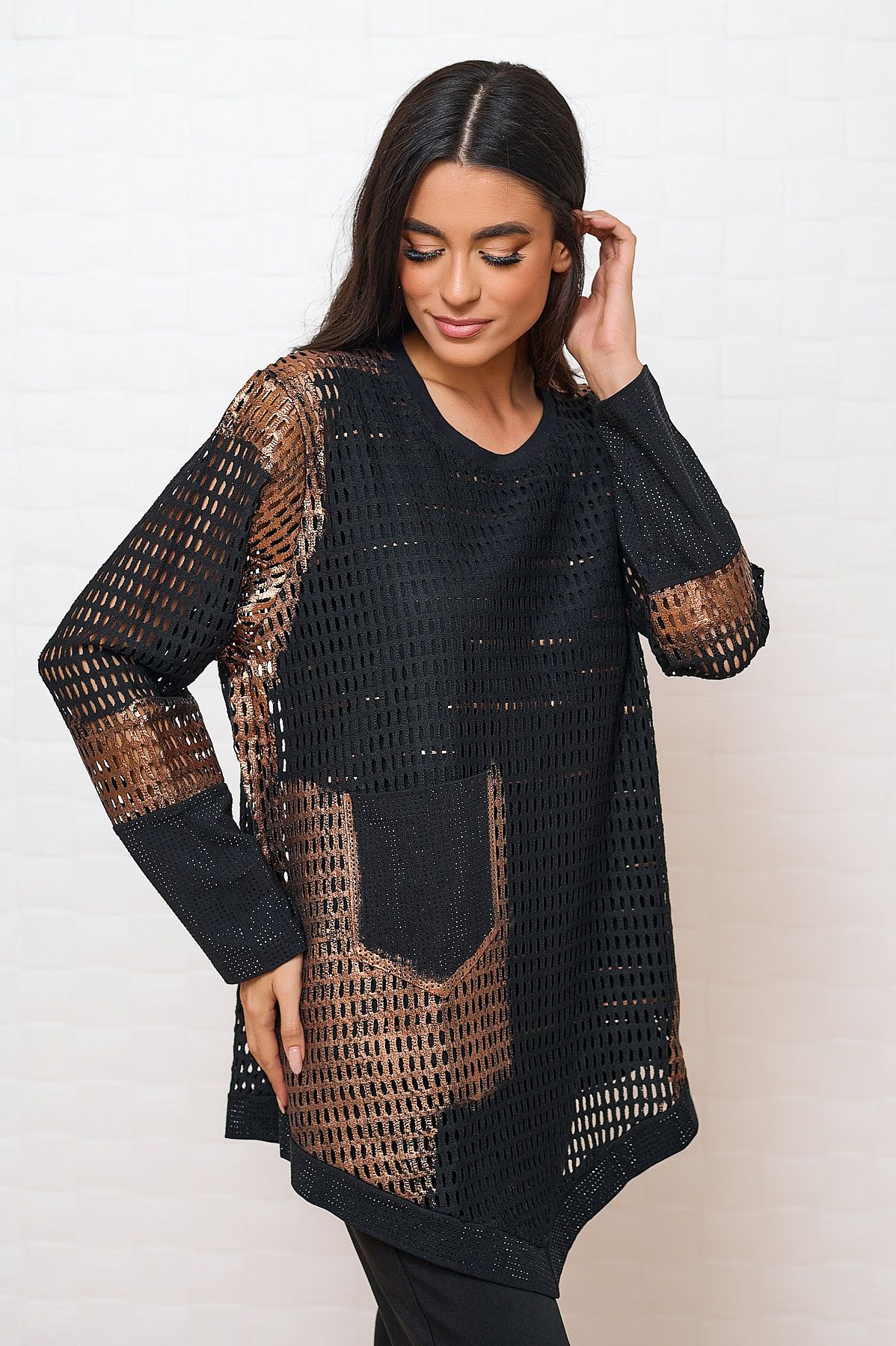 - η από πάνω μπλούζα είναι μακριά διχτυωτή κι ασύμμετρη με μακριά μανίκια