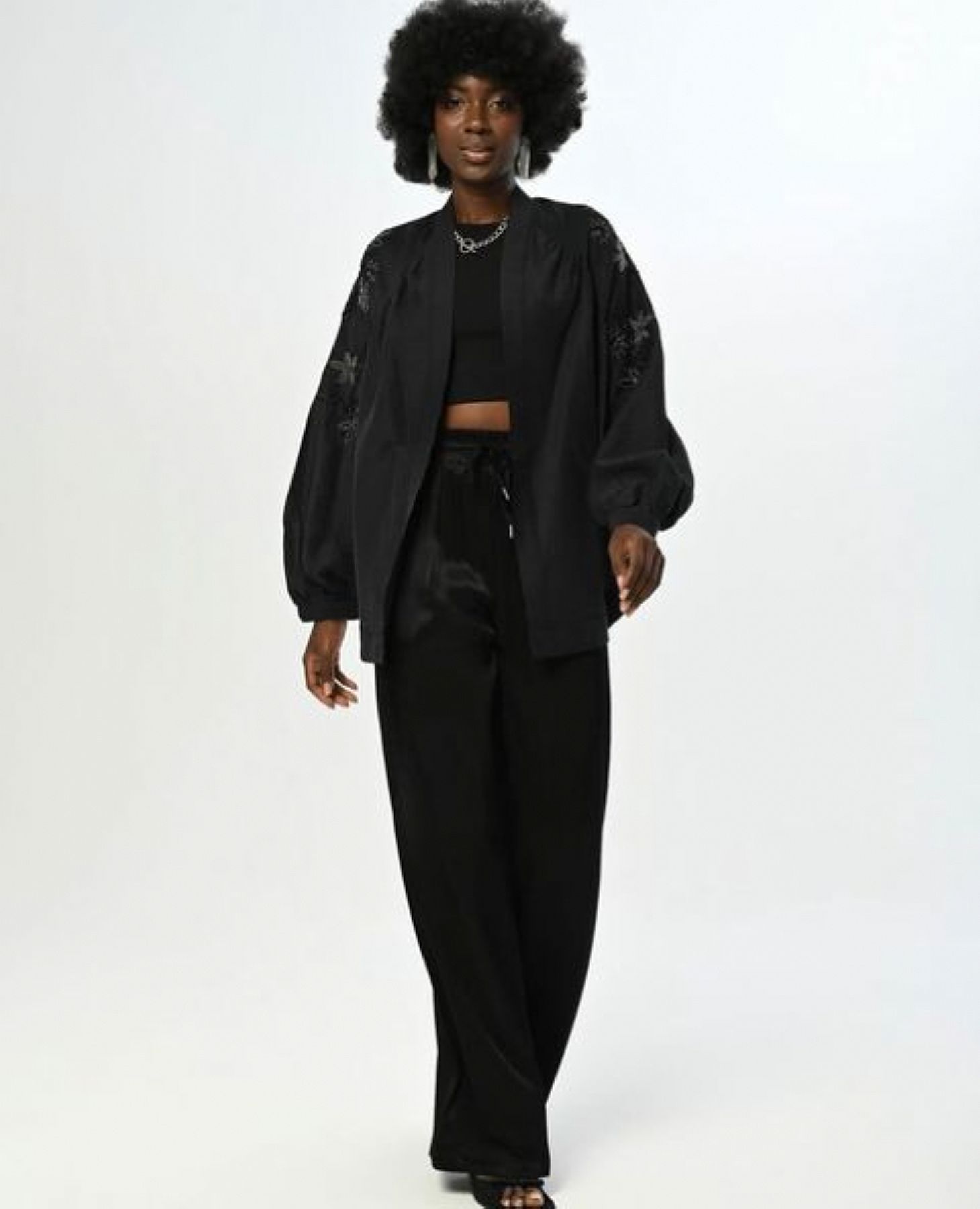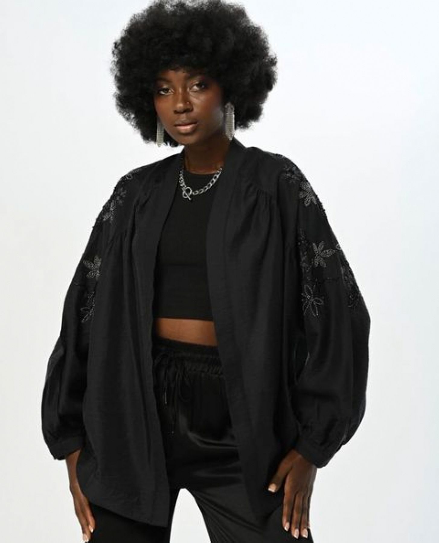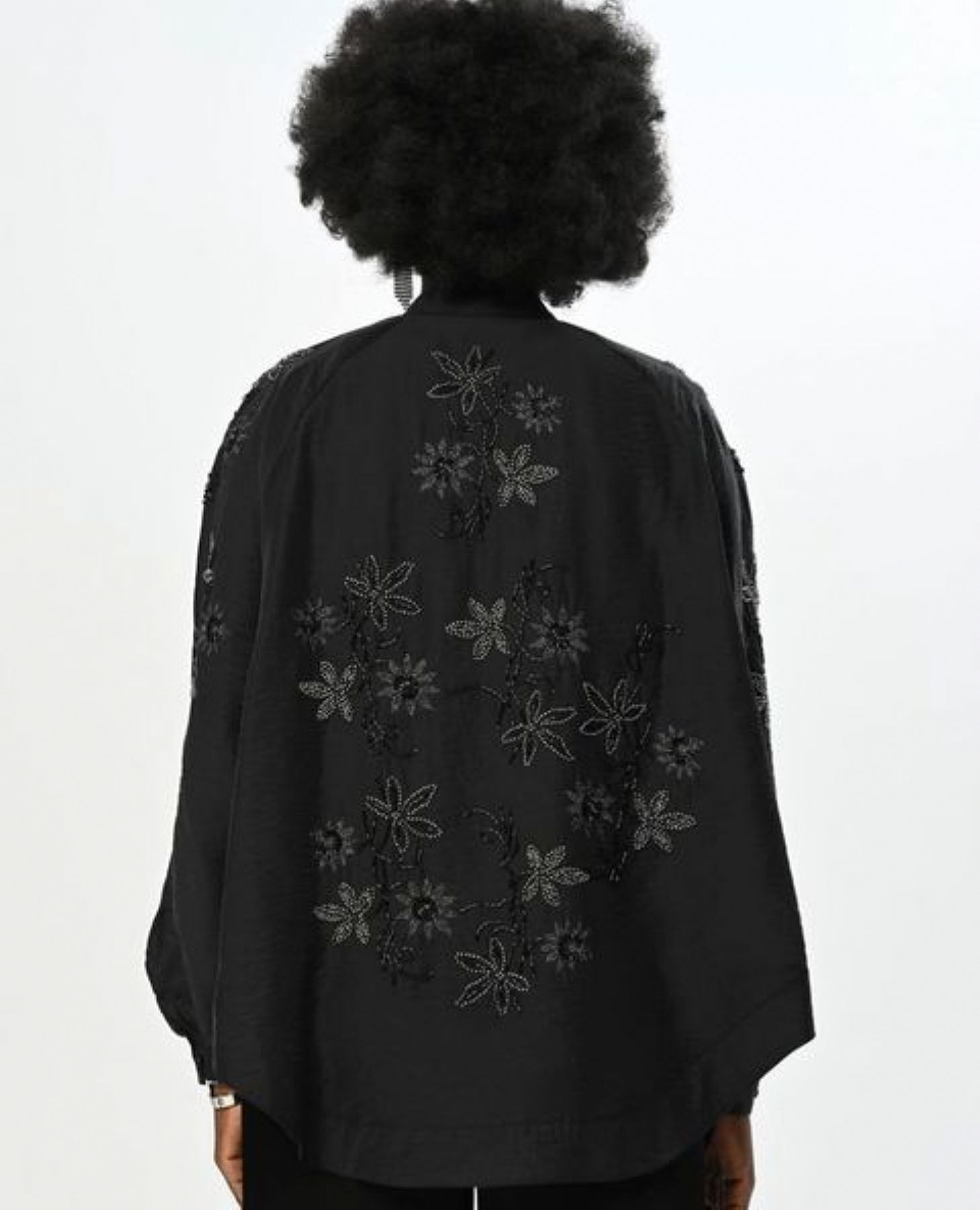 - Έχει κέντημα με ασημί και μαύρη χάντρες στα μανίκια και στη πλάτη